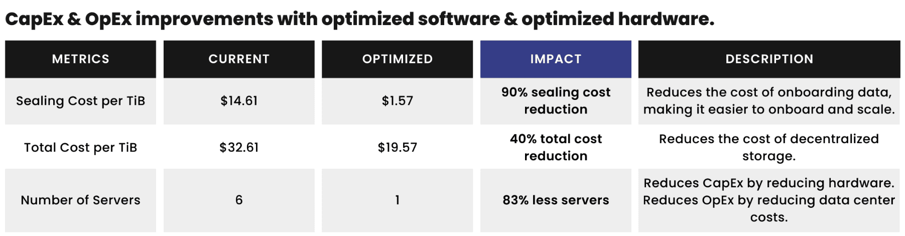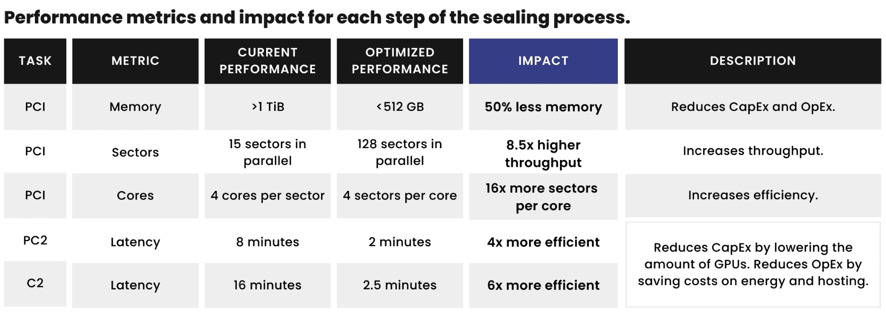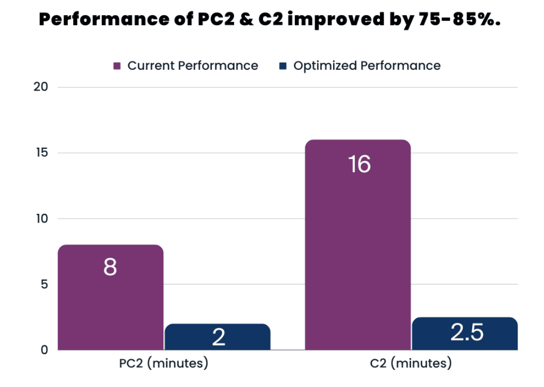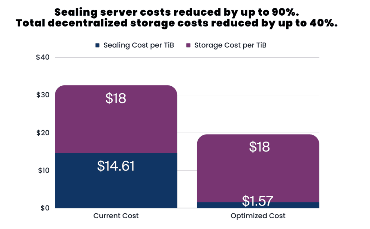 We are pleased to introduce the new software optimizations along with optimized hardware reference configurations. The impact on Storage Providers will vary based on individual hardware and setups; nevertheless, the entire ecosystem can anticipate improved performance and reduced costs with 75-85% increased throughput to PC2 and C2 that will be integrated directly into Lotus. The new optimized software with optimized hardware reduces sealing server costs by up to 90% for Storage Providers, leading to an up to 40% overall cost reduction to decentralized storage. As an example of cost savings, it used to cost over $200,000 to purchase sealing servers to seal 20 TiBs per day. It will now cost under $25,000 to seal 20 TiBs per day. Furthermore, Storage Providers will benefit from a noticeable reduction in operational costs as a single server can now efficiently handle all sealing tasks, achieving a remarkable 6x+ higher throughput.