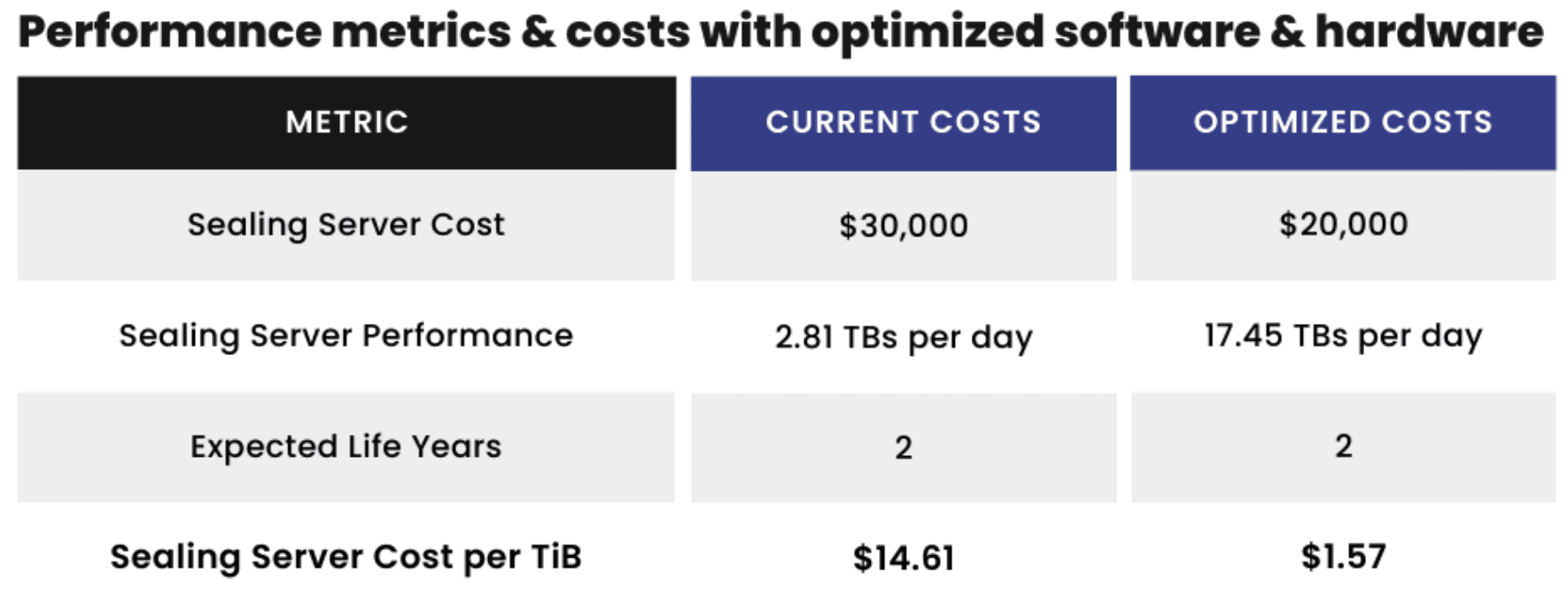 The Filecoin Network relies on computations performed on the data being onboarded in order to ensure network security and enable cryptographic proving, verifiability, and data immutability. However, the hardware required to execute this process, known as "sealing," often accounts for more than 50% of the total hardware expenses. This poses a challenge for new Storage Providers aiming to join the network and for existing ones seeking to enhance their data onboarding capacity. To address this issue, we are excited to announce the release of new software that optimizes data onboarding for the Filecoin network, resulting in sealing server cost reductions of up to 90%. By leveraging this software, network participants can benefit from decreased compute costs while experiencing increased compute power. Please see below for a breakdown of cost and performance metrics calculations. Although the benchmarks are for CC, we expect to see similar results for non-CC as well.